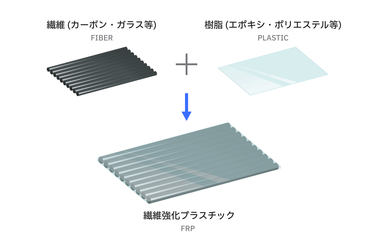 たとえば炭素繊維は非常に軽く強い素材ですが、それ単体では糸束にすぎません。樹脂と一体化することで初めて高い機能と性能を発揮します。FRPはまさに「繊維」と「樹脂」を組み合わせた複合材料であり、その組み合わせにより用途に応じた特性を設計できます。