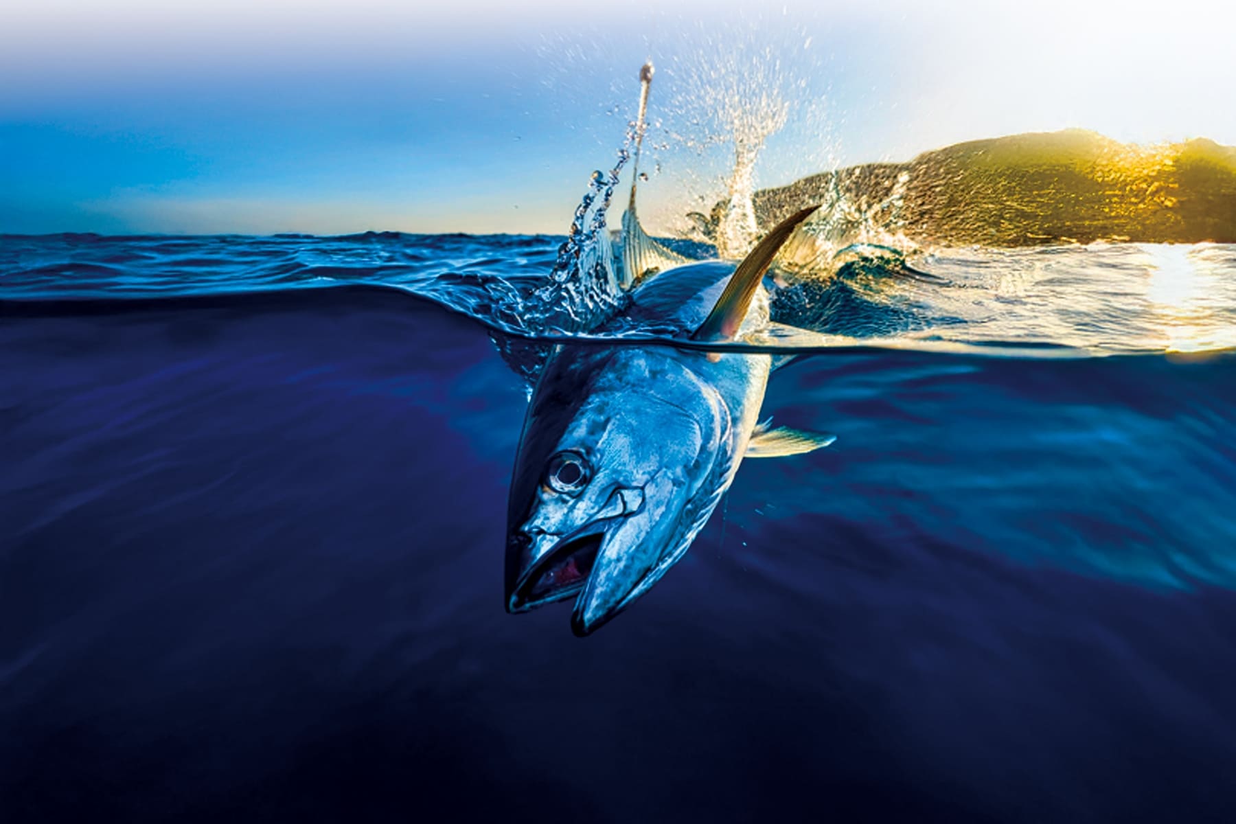 メインラインから吊るされているルアーを海面上で躍らせながら魚を誘う。